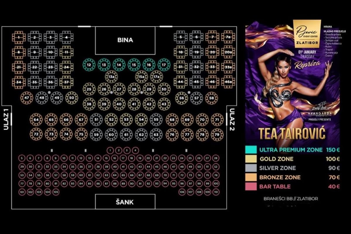 Za fenomenalnu energiju na bini pobrinuće se Tea Tairović, koja će svojim nastupom doneti pravu eksploziju emocija i odlične zabave. Uz bogato hladno predjelo koje je uključeno u cenu karte (za banket sedenja), kao i piće po utrošku, gosti će uživati u reprizi koja obećava da bude podjednako upečatljiva kao i sam doček.