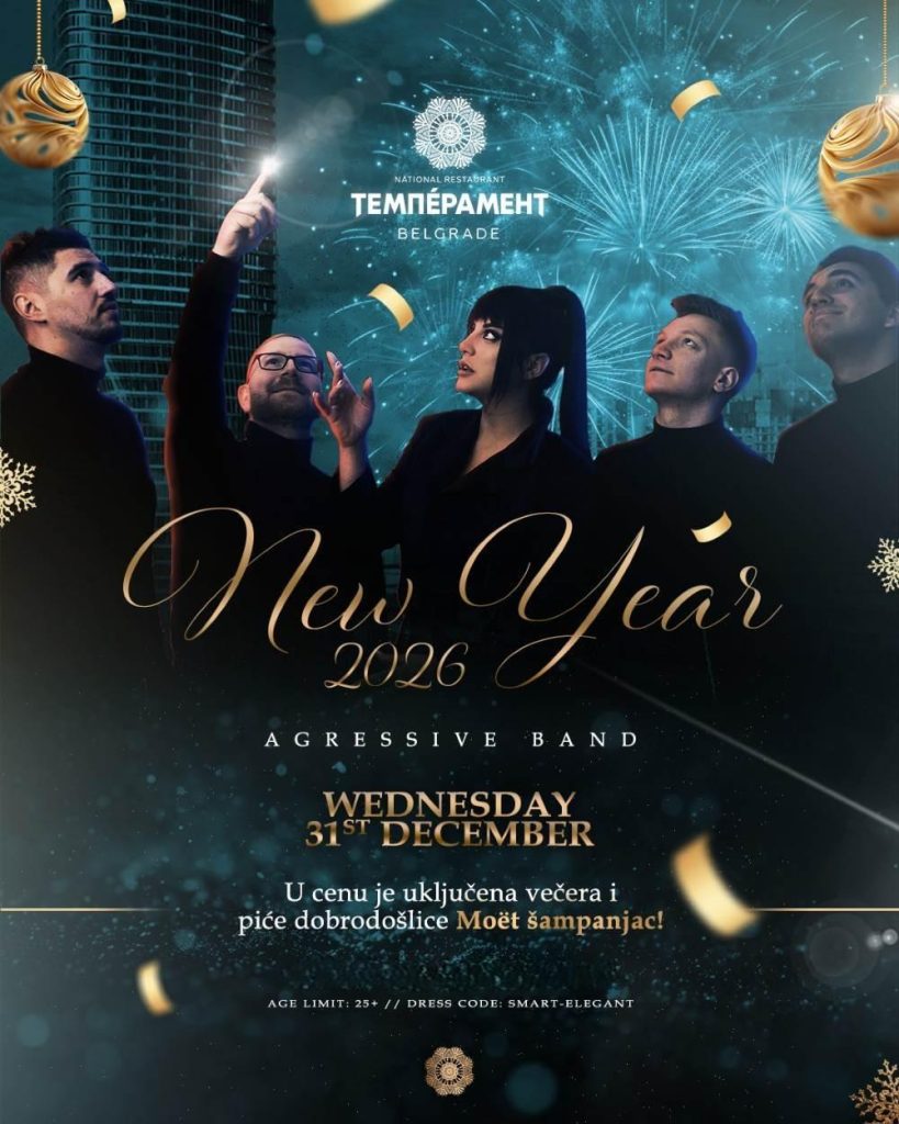 Muzika Agressive band-a stvara energičnu atmosferu koja će vas podstaći na ples i zabavu. Uživajte u piću po utrošku, uz jedan koktel dobrodošlice koji će dodatno obogatiti vašu proslavu. Ovaj doček je savršena prilika da proslavite ulazak u Novu godinu u prijatnom i elegantnom ambijentu.